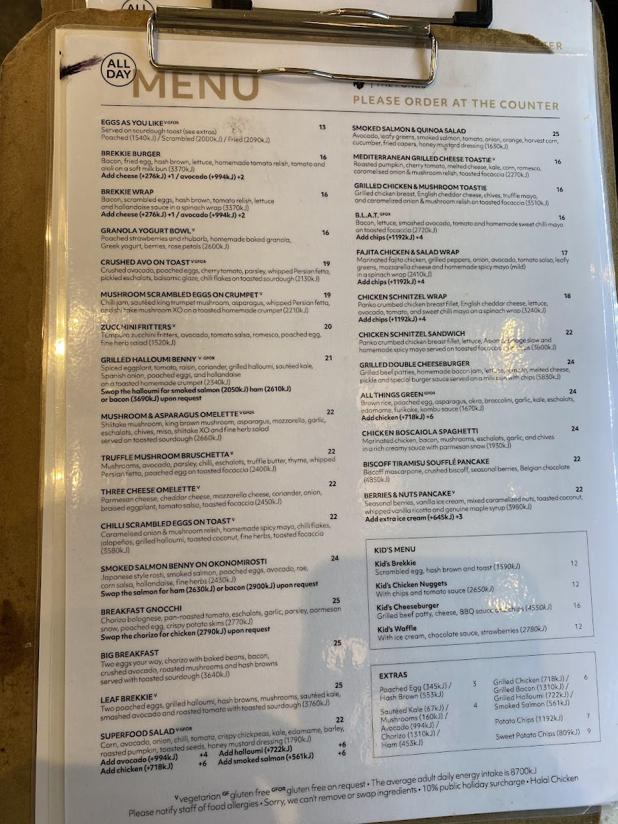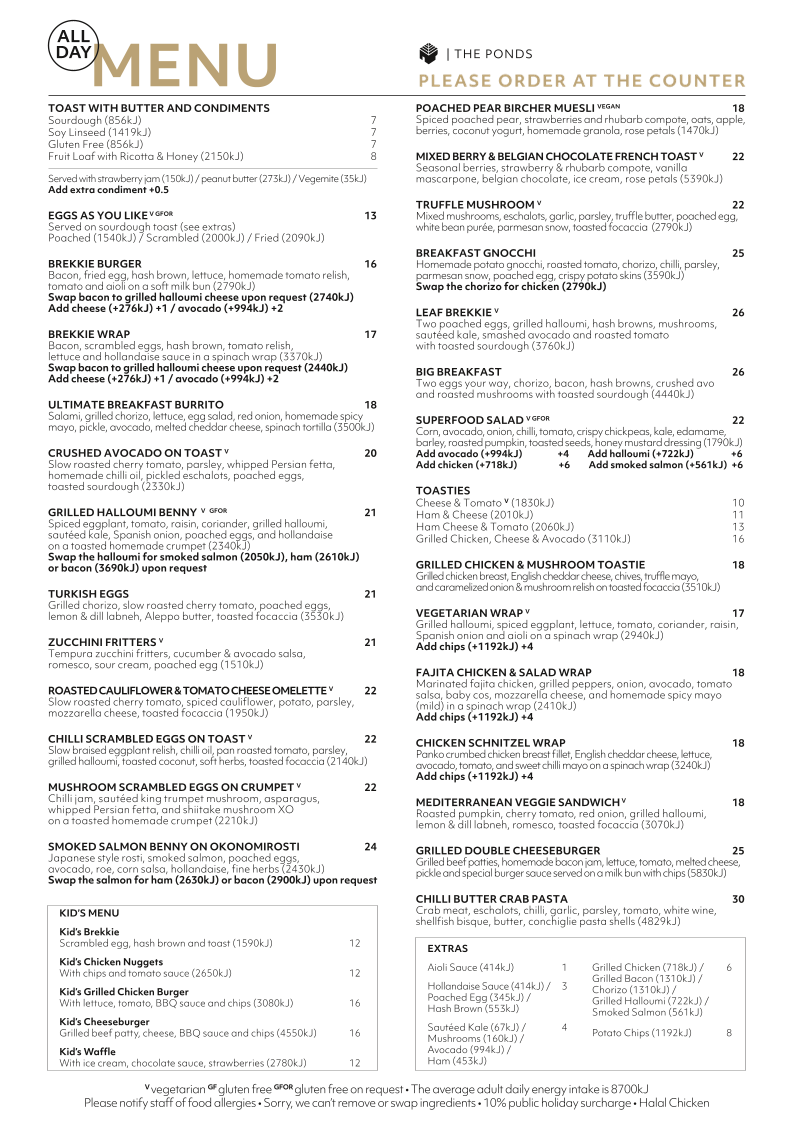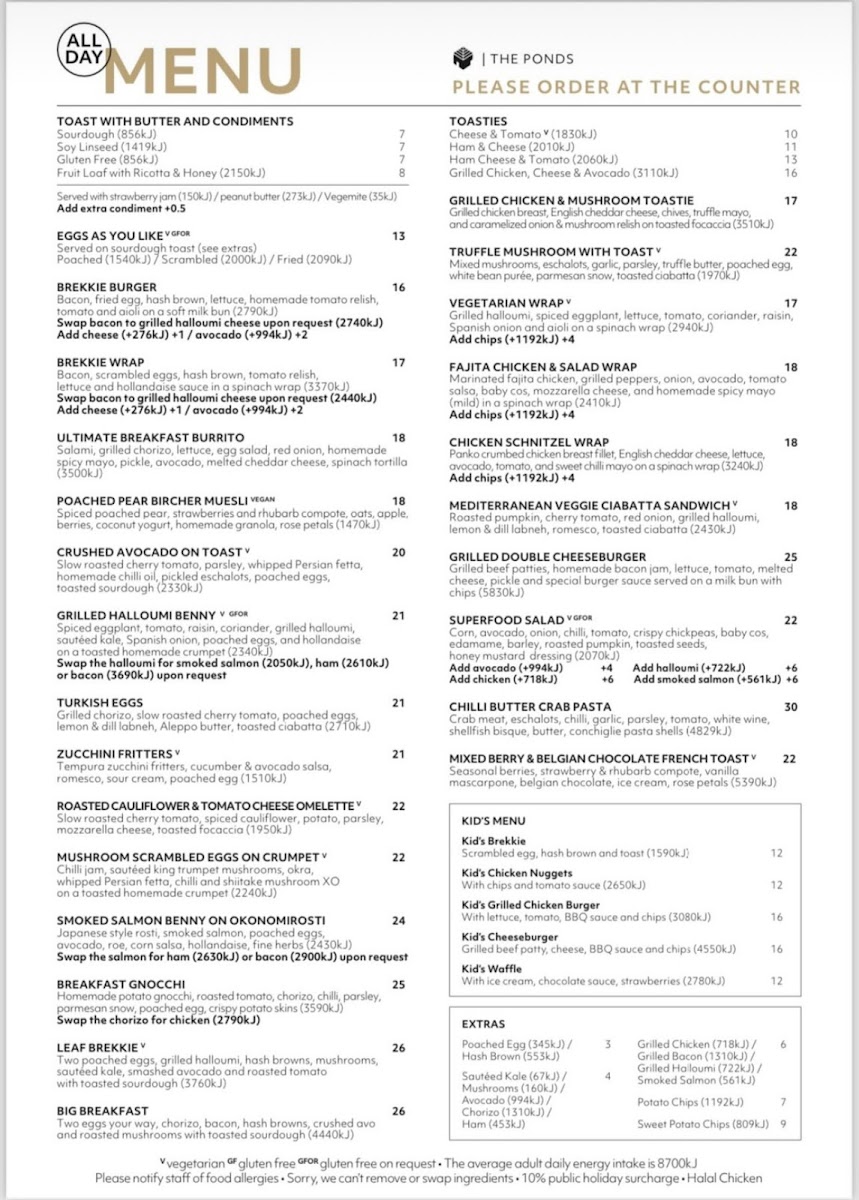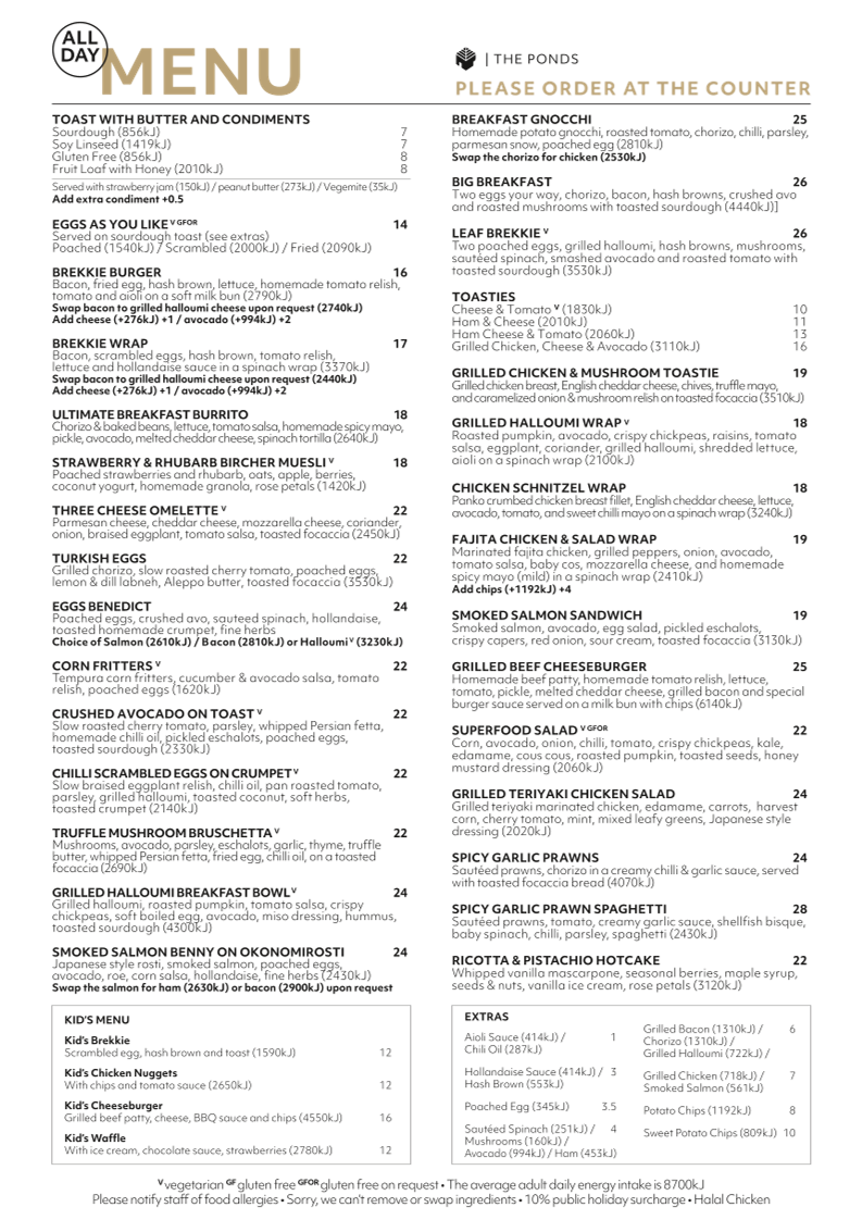 The menu at Leaf Cafe & Co. The Ponds offers a delightful range of options for all tastes and occasions. For coffee lovers, the drinks section features a variety of espresso-based choices including Cold Drip Coffee, Espresso - Ristretto, Espresso - Short Black, Espresso - Long Black, and Espresso - Macchiato. For a light and simple start, the All Day Menu includes various toast options such as Toast with Butter and Condiments on Sourdough, Soy Linseed, Gluten Free, and Fruit Loaf with Honey. You can also enjoy Eggs as You Like, which is perfect for a customized breakfast. The Kid's Menu caters to younger guests with options like Kid's Brekkie, Kid's Chicken Nuggets, Kid's Cheeseburger, and Kid's Waffle, making it a family-friendly dining experience. Whether you’re in the mood for a quick coffee or a light bite, Leaf Cafe & Co. offers something for everyone.